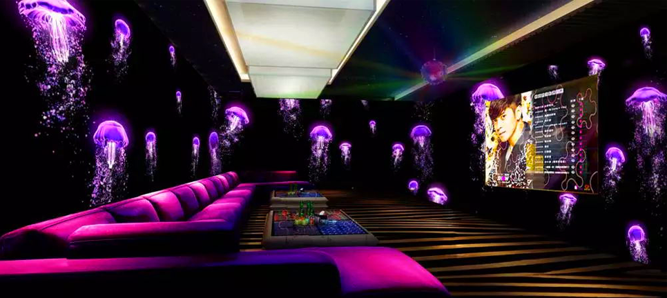 将环境影视、3D技术、高分辨率图像,通过多通道无缝同步技术,投影出超大画面,把整个KTV包间,渲染成一种演唱现场的气氛。