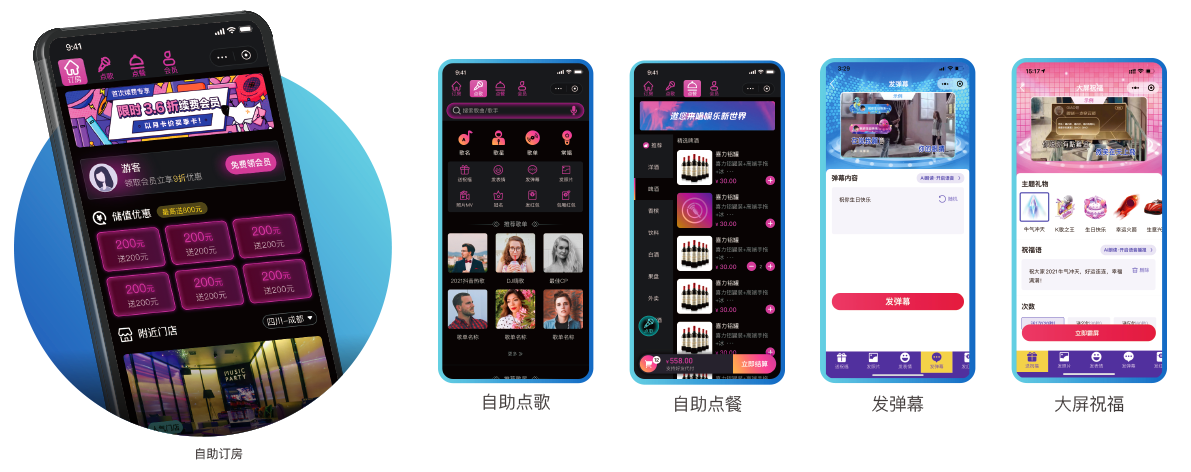 K歌订房APP,订房、开放、点歌、点单等服务,只需一部手机,即可实现从包厢预订到点单的全程自助式消费,便利用户消费。