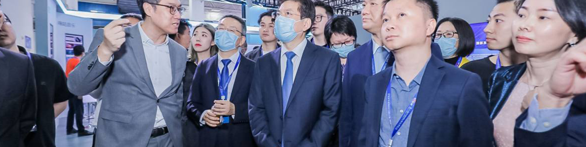 (中宣部副部长张建春(中)等领导莅临展位参观,中国文化行业娱乐协会秘书长孔明(左一)为领导及嘉宾详细介绍展览情况)