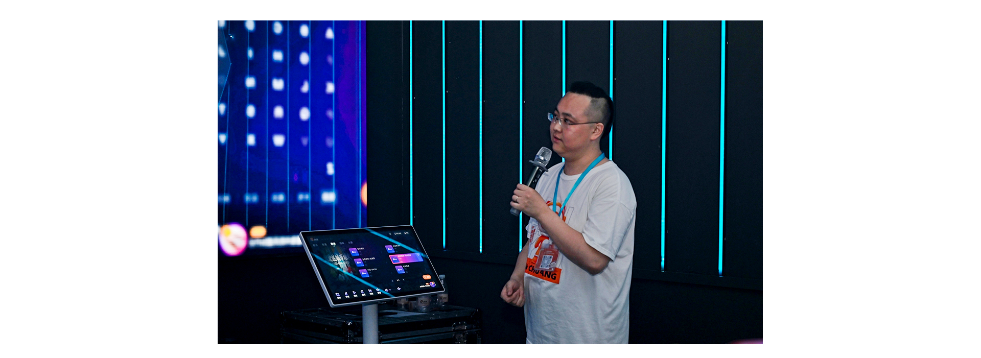 在商用演示厅内,音创商用产品经理胡劭斌为到场人员做整体的商用解决方案讲解,以全新推出的畅K娱乐系统V11出发点,从K歌、交互、玩法三个方面来切入,真实生动地展现音创商用解决方案的价值,让现场人员更真切地感受音创产品的魅力。